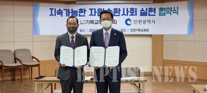 인천기독교총연합회(총회장 김기덕 목사)는 인천광역시(시장 박남춘)와 지난 5월 3일 인천기독교회관 7층에서 ‘지속 가능한 자원순환사회 실현 협약식’을 가졌다.