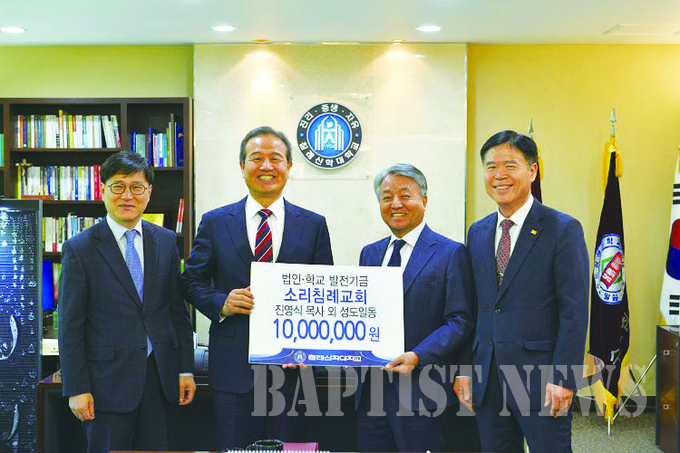 소리교회 진영식 목사(사진 오른쪽 두 번째)는 지난 5월 7일 대전 침례신학대학교(총장 김선배)를 방문하고 대한 법인·대학 발전기금 1000만원을 기탁했다.