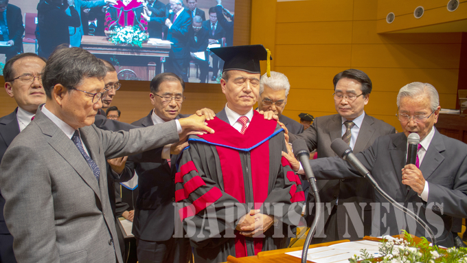 이어 학교법인 한국침례신학원 전 이사장 박선제 목사(대신), 이봉수 목사(광천), 구정환 목사(대석), 우리교단 전 총회장 곽도희 목사(남원주), 유관재 목사(성광), 학교법인 한국침례신학원 전 이사 조현철 목사(천안충무로), 교직원 대표 장수한 교수가 김선배 총장에게 안수기도로 축복했다. 축복기도 후 “역사적 전통은 강한 리더십에서 나오는 만큼 이사회는 김선배 총장을 탄탄하게 돕겠다”고 강한 메시지로 밝힌 학교법인 한국침례신학원 이사장 심치열 박사의 권면, 침례신학대학교 허긴 및 도한호 전 총장, 직전 총회장 안희묵 목사(꿈의)가 격려사를, 전 법제처장 성광원 박사와 충남대학교 총장 오덕성 박사, 침례신학대학교 총동창회 회장 이종성 목사(상록수)가 축사를 전했으며, 교단기관장협의회 회장 이요섭 원장이 대표로 취임축하패를 전달한 뒤, 전 이사장 성지현 목사(예산)의 축도로 취임예배를 마쳤다.