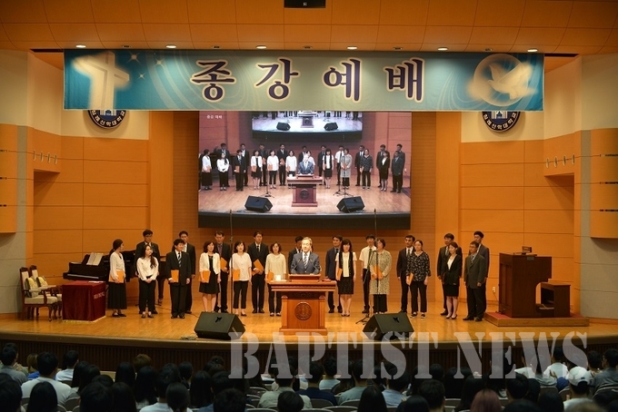 침례신학대학교(총장 김선배)는 지난 6월 4일 교단기념대강당에서 2019년도 1학기를 마무리하는 종강예배를 가졌다. 특별히 이날 사무처, 생활관, 도서관 직원들이 특송하고 총장이 직접 특송을 부른 직원들을 한 사람씩 소개하고 격려하는 시간을 가졌다.