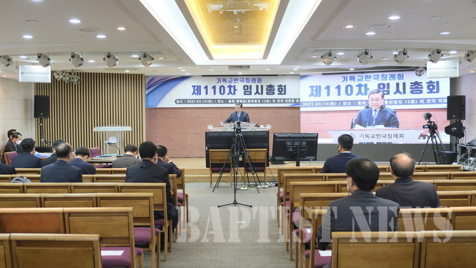 제110차 총회(총회장 박문수 목사)는 지난 4월 13일 서울 여의도 총회 13층 대예배실 외 15개 지정된 장소에서 임시총회를 진행했다.
