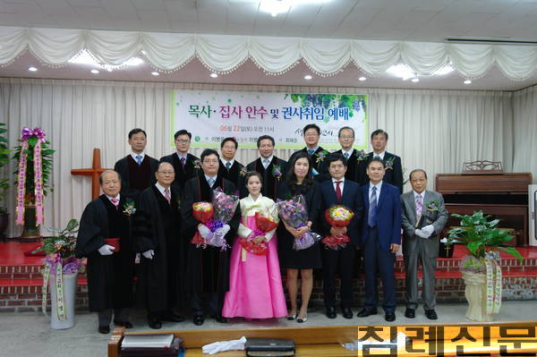 그리고 하태현 목사가 안수집사 시취경과보고를 하고 안수를 받을 이병의 집사의 서약이 있은 후, 안수위원들의 안수례와 동시에 이명건 목사(비전)의 안수기도에 이어 이병웅 목사(새천안)의 공포와 안수패를 증정했다.