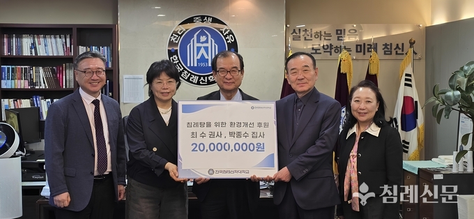 강남중앙침례교회(최병락 목사, 강중침) 최수 권사와 박종수 집사 부부가 지난 4월 13일 한국침례신학대학교(총장 피영민)에 신학교 침례탕 신설을 위해 2000만 원을 후원했다.