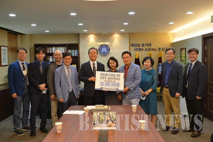 THE아름다운교회를 담임하고 있는 모영국 목사와 송정선 목사가 한국침례신학대학교(총장 김선배)에 대학발전기금 2000만원을 후원했다.