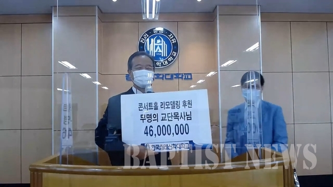 한국침례신학대학교(총장 김선배)는 지난 9월 8일 한 무명의 교단 목회자가 대학발전기금(콘서트홀 리모델링 후원) 4600만원을 기탁했다.