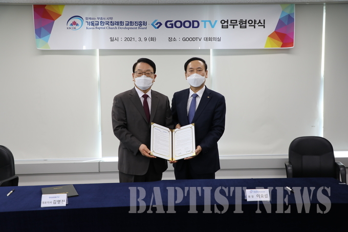 교회진흥원(이사장 정치호 목사, 원장 이요섭 목사)은 3월 9일 GOODTV기독교복음 방송(대표이사 김명전, 이하 굿티비) 대회의실에서 굿티비와 업무 협약을 체결하고 복음 전파 미디어 선교사역에 협력하며 상호 이익 증진을 위해 협력하기로 했다.