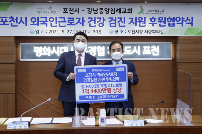 강남중앙침례교회(최병락 목사, 강남중앙)가 코로나19로 어려움을 겪고 있는 외국 인근로자를 위해 교회 나눔 프로젝트인 “요셉의 창고”를 열었다. 강남중앙교회는 지난 5월 27일 포천시(박윤국 시장)와 포천시 외국인근로자 건강검진 지원을 위한 후원협약을 맺었다.