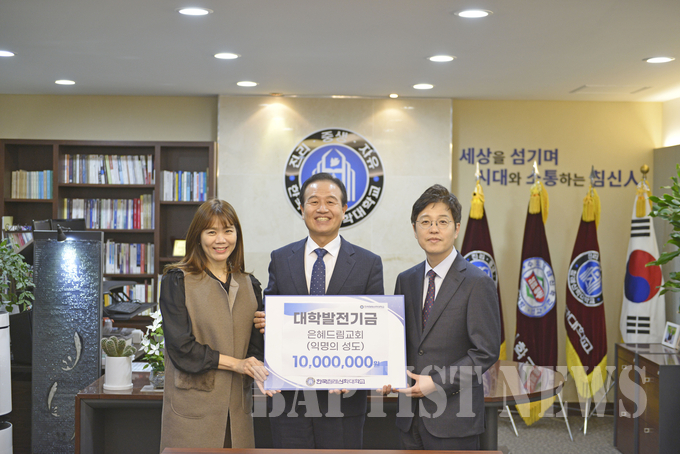 한국침례신학대학교(총장 김선배)에 서는 11월 2일, 은혜드림교회(최인선 목사) 익명의 성도로부터 대학발전후원금 1000만 원을 기탁받았다.