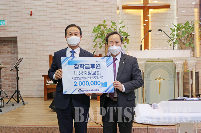 배방중앙교회 김병완 목사는 김선배 총장의 말씀에 감사의 뜻을 밝히며 “성도들의 마음을 모은 장학금 200만원을 학교의 발전과 학생들을 위해 기도하는 마음으로 기탁하고 앞으로도 학교를 위해 늘 관심과 기도로 후원하겠다”고 밝혔다.