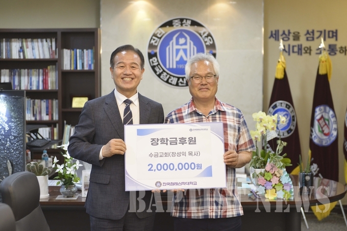 한국침례신학대학교(김선배 총장)는 수금교회 장성익 목사가 지난 5월 24일 학교를 방문해 생활이 어려운 중에도 학업에 열중하는 학생들을 위해 장학금 200만원을 기탁했다고 밝혔다.