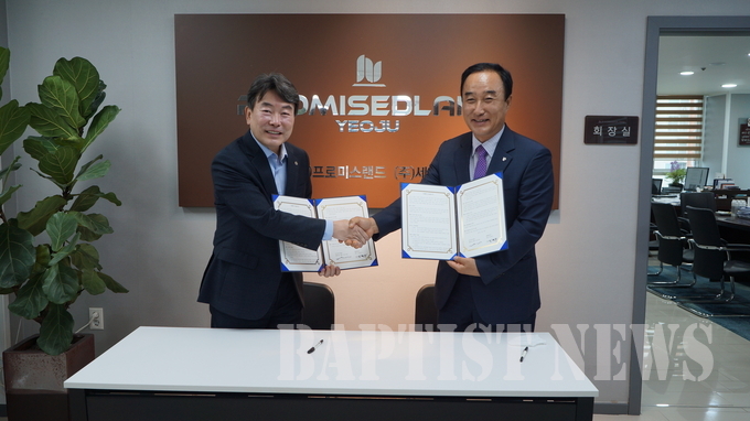 침례신문(이사장 김종이 목사, 사장 강형주 목사)은 (주)프로미스랜드(대표이사 윤국헌, 사진 왼쪽)와 멤버십 스쿨과 12교회 건립, 선교사역에 대한 업무협약을 체결했다.