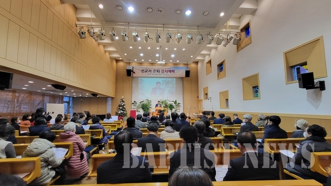 2부 순서는 은퇴선교사들을 소개하고 축하하는 시간을 가졌다. 해당 선교사들이 소속돼 있는 각 지부들은 감사예배 현장에 참석하지 못한 아쉬움을 영상으로 대신했다. FMB 이사인 문기태 목사(창원)의 기도로 마무리한 2부 순서에 이어 3부는 만찬을 즐기며 교제를 나눴다.