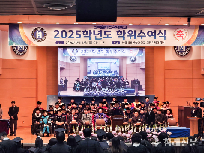 한국침례신학대학교(피영민 총장, 한국침신대)는 지난 2월 12일 교단기념대강당에서 2025학년도 학위수여식을 열고 학부·대학원 졸업생과 목회연구원·평생교육원 수료생을 파송했다. 이날 학위수여식에서는 학사 160명, 석사 131명, 박사 8명, 목회연구원 12명, 평생교육원 5명 등 총 316명이 학위와 수료증을 받았다.