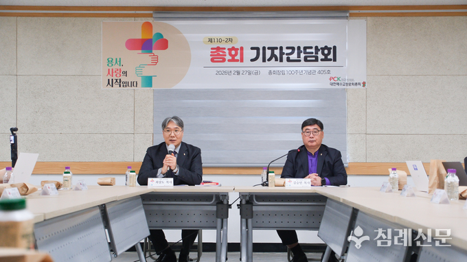 대한예수교장로회 통합총회(총회장 정훈 목사)는 지난 2월 27일 서울 종로구 총회창립100주년기념관에서 기자간담회를 열고 110회기 핵심 추진 사역과 중장기 정책 방향을 설명했다. 이날 간담회에는 최상도 목사(사무총장)와 김승민 목사(서기)가 참석해 장기 비전 ‘생명문명·생명목회순례 10년 정책’, 유럽 선교노회 설립, 총회장 특별사업(코피노와 함께하는 한국교회의 공적 사명) 등을 중심으로 올해 주요 과제를 소개했다.