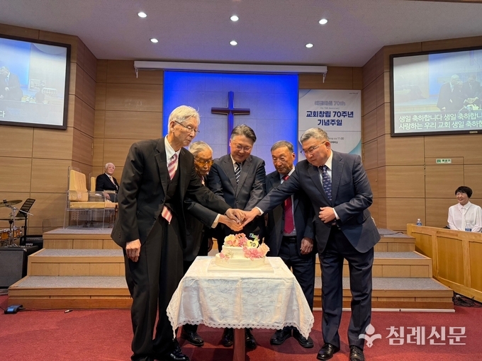 지난 교회 역사 가운데 은혜가 됐던 순간들과 젊은 세대를 향한 은퇴 장로들의 축복 메시지를 통해 70년 동안 교회에 베푸신 하나님의 놀라운 은혜를 기억하는 시간이었다. 이어 교회를 대표해 권혁수 목사와 은퇴 장로 4인이 함께 생일 축하 노래를 부르고 케이크 커팅식을 진행했다.