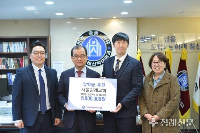 서울침례교회(김성봉 목사)는 지난 3월 12일 한국침례신학대학교(총장 피영민)에 장학금 500만원을 후원했다.